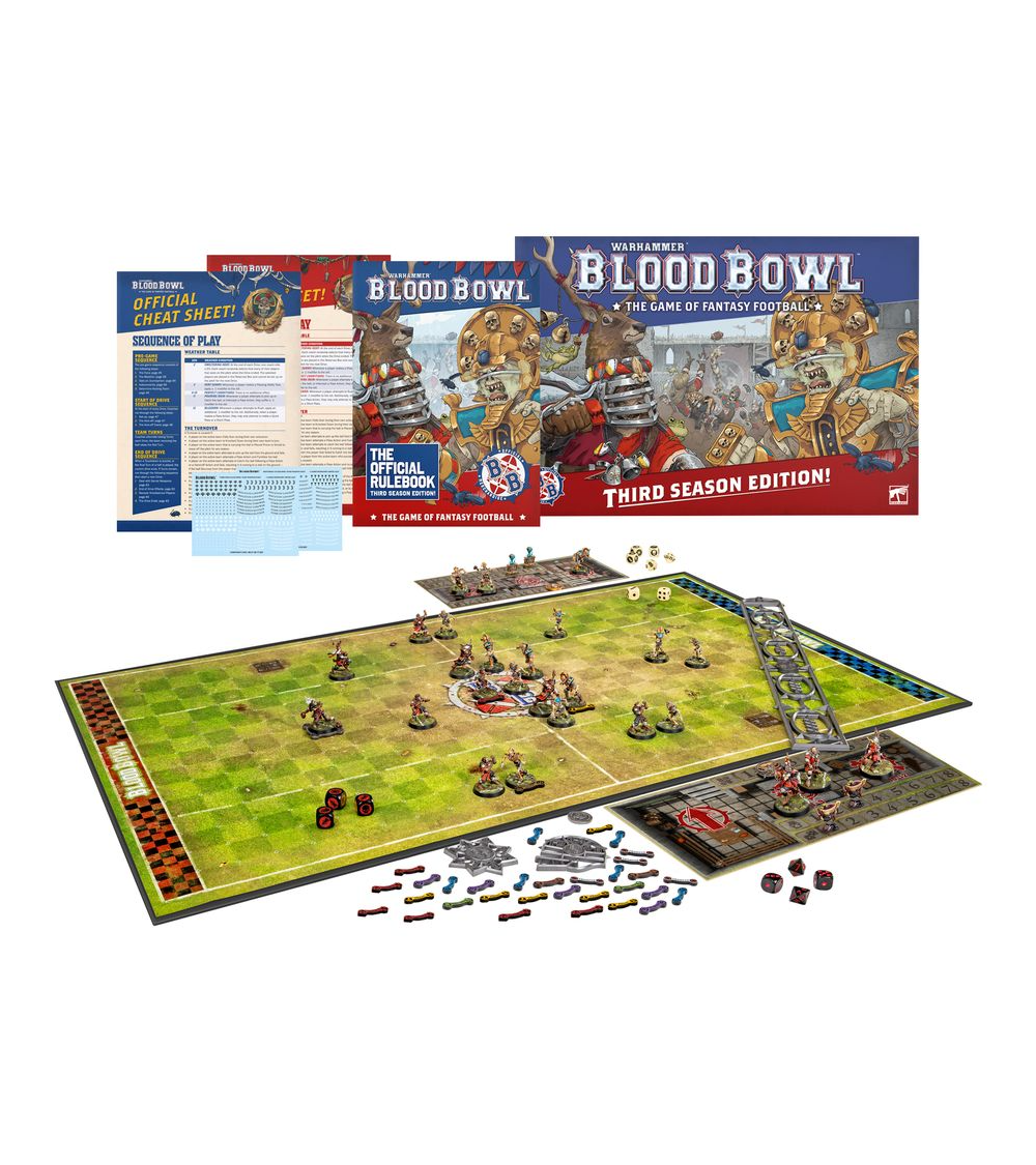 – 1x 200-page hardback Blood Bowl: The Official Rulebook – Third Season Edition! explaining the rules of the game, how to run a league and develop your team, plus Team Rosters and player profiles