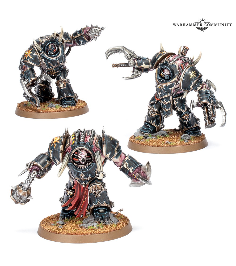Revêtus d'armures Terminator difformes, leurs corps mutés sont méconnaissables. De la chair immonde et des cornes saillent par les failles qui percent leurs armures autrefois nobles. Leurs membres se terminent en grappes cruelles d'horribles armes métallodermiques, dont de lourdes masses et d'énormes griffes énergétiques. Les armes sont interchangeables entre toutes les figurines, ce qui vous permet de personnaliser facilement vos troupes de choc briseuses de lignes.