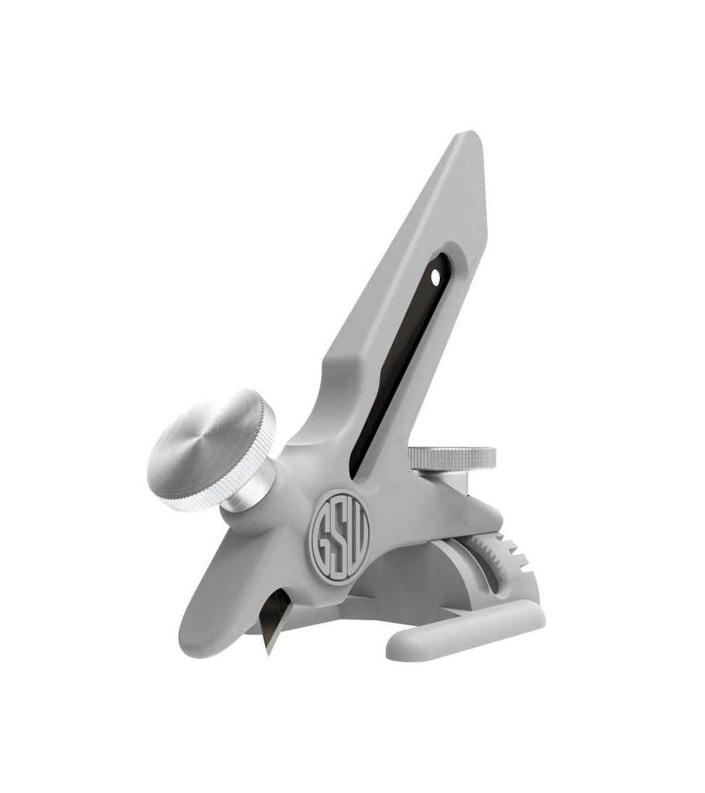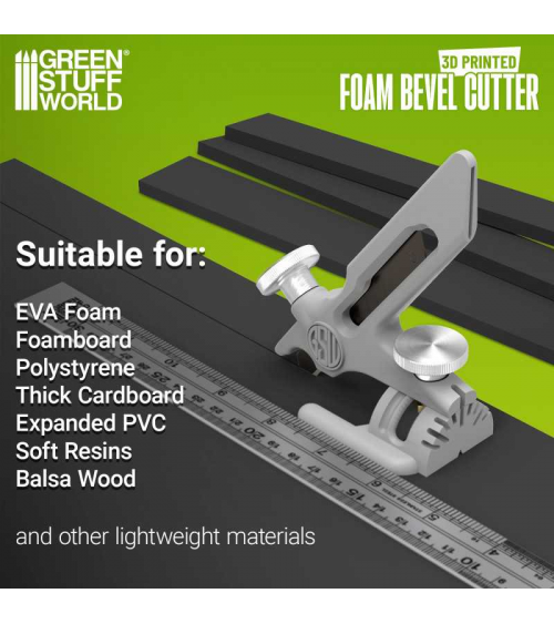 Son utilisation est très simple : insérez une lame neuve de 18 mm dans le support, réglez l'angle souhaité et verrouillez-le en place. La base du coupe-mousse repose à plat contre votre matériau et la lame inclinée coupe proprement lorsque vous appliquez une légère pression vers l'avant. Comme la lame reste à un angle fixe, elle produit un bord biseauté lisse et continu qui serait difficile à reproduire avec un couteau de modelisme ordinaire. Comme toujours, pour protéger votre surface de travail, nous vous recommandons d'utiliser un tapis de coupe en dessous.