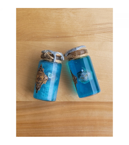 Il s’agit d’une fiole contenant un dé qui flotte magiquement dans un liquide coloré et qui disparait dans des volutes pailletées quand celle-ci est secouée.