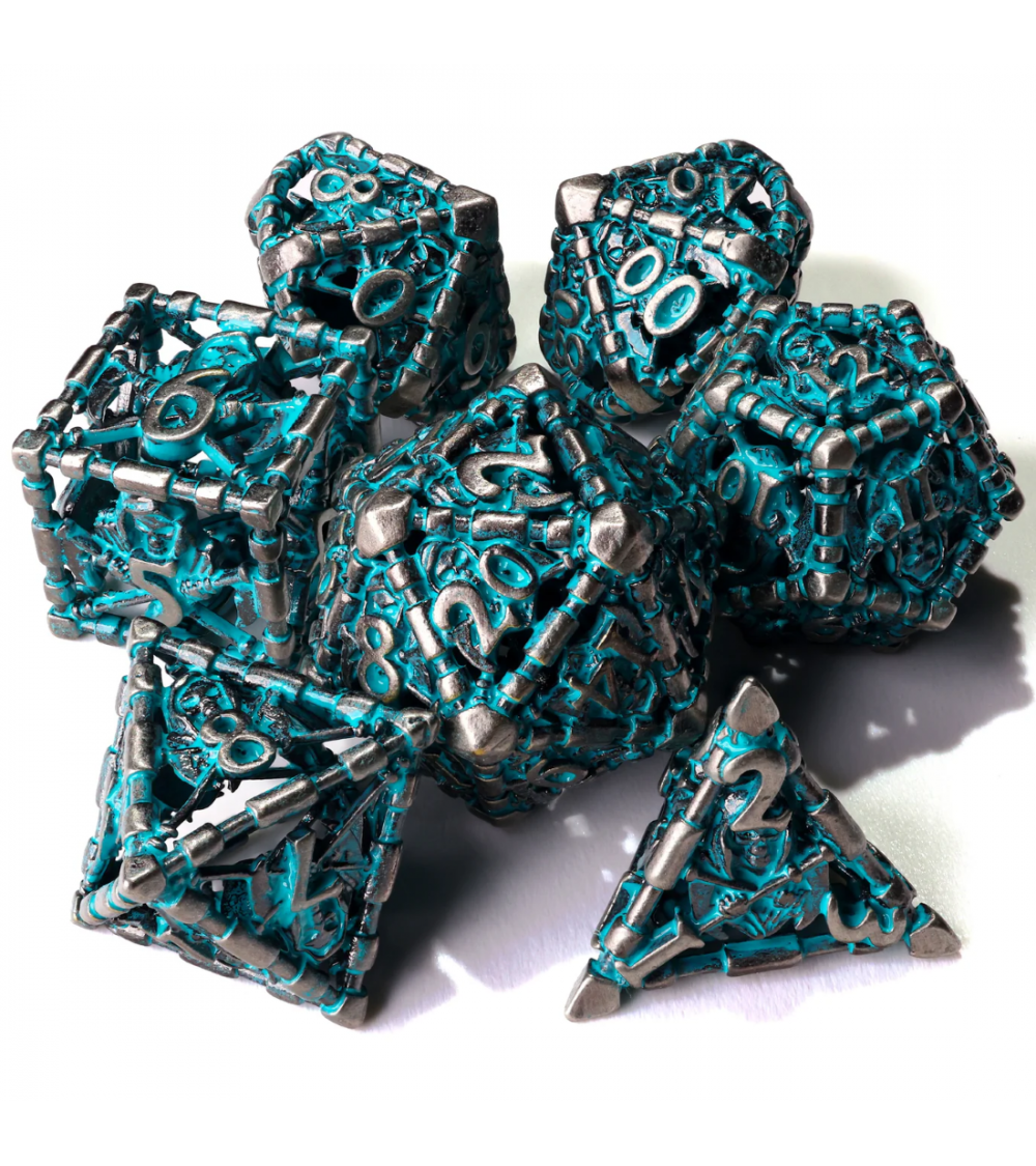 Grim Reaper Teal Glow Metal RPG Dice Set - 7 Pieces