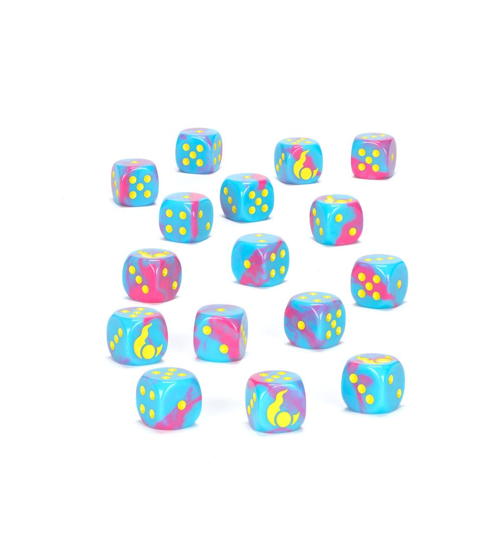 Ce produit est un set de 16 dés à six faces, aux angles arrondis, utilisables dans les parties de Warhammer Age of Sigmar, et sur le thème des Disciples de Tzeentch. Ils sont moulés en plastique acrylique bleu et rose avec des marquages jaunes et mesurent 16mm de côté. Les faces 1 à 5 sont numérotées de façon traditionnelle, et chaque face du 6 est frappée de l'icône lunatique des Disciples de Tzeentch. Ces dés thématiques sont uniquement disponibles jusqu'à épuisement de stocks.