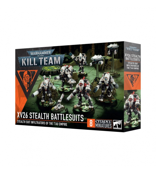 Ce kit en plastique permet d'assembler huit agents en Exo-armures XV26 Stealth. Ces figurines peuvent être utilisées comme guerriers caméléoniques en Exo-armures XV26 Stealth dans les parties de Kill Team, ou alignées au sein d'une armée de l'Empire T'au dans les parties de Warhammer 40,000. Le kit inclut des options, des accessoires, et différentes têtes pour personnaliser votre kill team, ainsi que les pièces pour assembler des spécialistes tels le Neutralisateur brouilleur de signaux, l'Infiltrateur camouflé, le cavalier solitaire qu'est l'Étoile Polaire, et d'autres.
