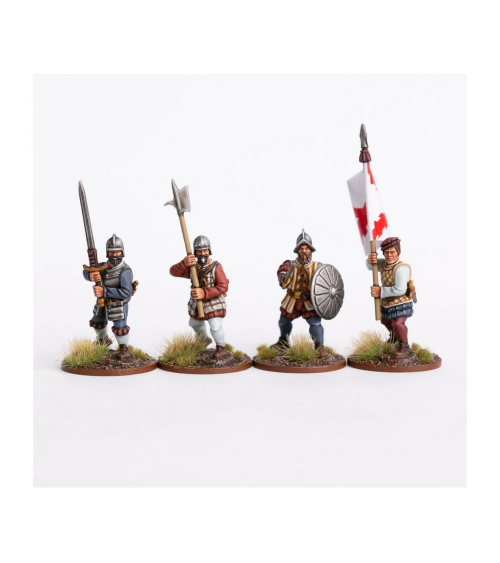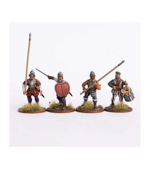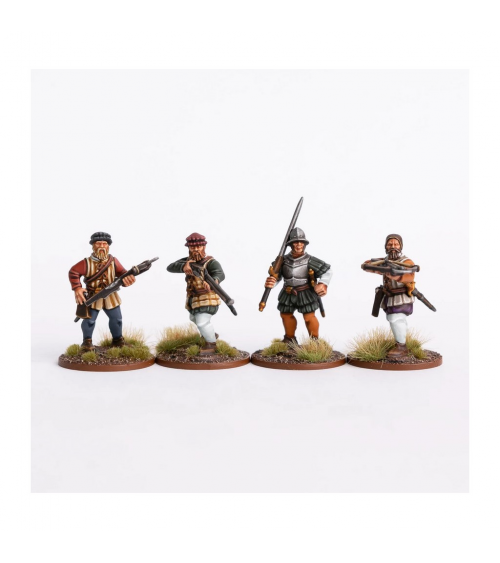 Ce coffret vous permet de construire jusqu'à 24 soldats, en plastique, équipés d'une épée, d'une lance, d'une hallebarde, d'une arbalète et d'un mousquet, avec des options supplémentaires pour les piques et les épées à deux mains. Un mélange de types de chapeaux et de casques permettra d'étendre leur utilisation aux champs de bataille de l'Europe du XVIe siècle.
