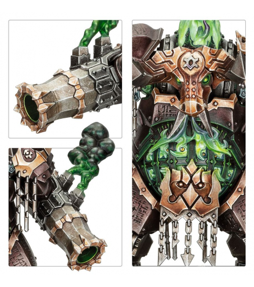 Créée à l'image de Hashut, la Machine Dominotaure est à la fois un fourneau embrasé et une cage pour les démons asservis qui l'alimentent. Des flammes et fumées maudites s'échappent de cette construction. De nombreuses runes sont gravées sur toute sa carapace pour la rendre encore plus impressionnante et s'assurer que les démons piégés à l'intérieur ne puissent s'évader. Vous avez le choix de l'armer d'immenses massues pour écraser vos adversaires au corps à corps, ou de canons d'immolation pour incinérer l'ennemi à courte portée. Il y a un choix de deux tabards métalliques, deux paires de cornes, et deux plaques faciales pour personnaliser votre automate.
