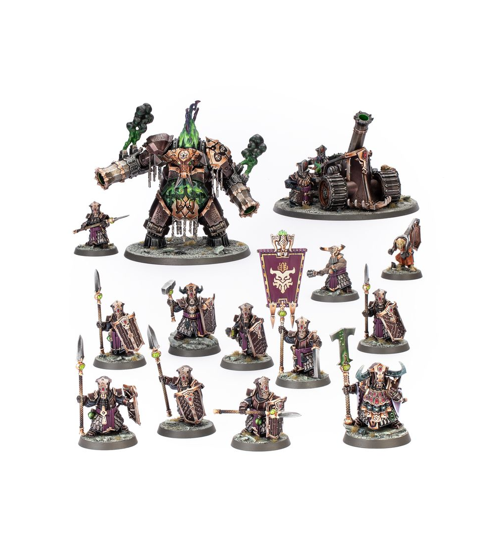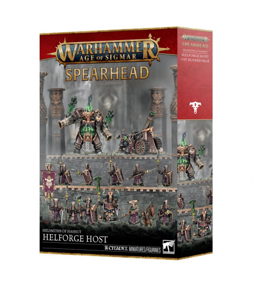 Le Père-Taureau a soif de pouvoir, et cette boîte est le moyen idéal d'entamer une nouvelle collection de Forgeruines de Hashut ou d'agrandir une armée existante tout en faisant des économies par rapport à un achat des kits au détail. Menée par un cruel Despote de Guerre, cette force se compose d'une Cohorte Infernale prête à répandre la ruine sur l'ennemi, soutenue par une Bombarde de Tourment et une puissante Machine Dominotaure. Le tout forme un bataillon implacable à même d'affronter tout type d'ennemi. Ces figurines composent une force de Fer de Lance complète, ce qui vous permet de vous lancer dans des parties réduites et tactiques sans attendre.