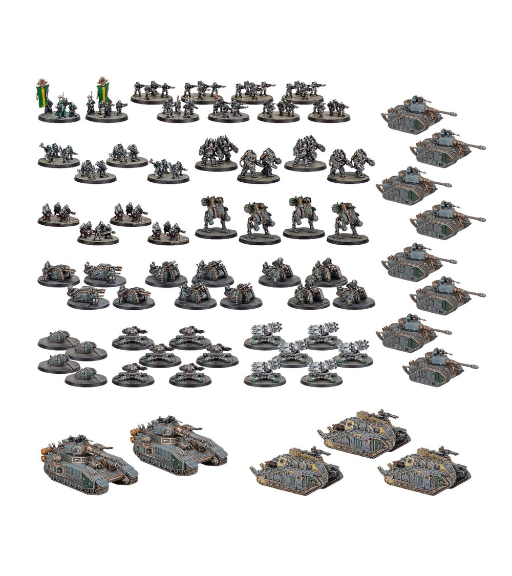 Ce kit en plastique permet d'assembler 157 figurines individuelles à l'échelle Epic, qui se combinent en 67 socles d'infanterie ou véhicules, pour vos armées des Solar Auxilia dans les parties de Legions Imperialis. Le gros de cette force inclut un mélange d'infanterie et d'unités de commandement, au côté d'un contingent de bonne taille de plateformes d'armes lourdes et de Sentinel. Ces unités sont soutenues par un bon nombre de chars de combat, pouvant être personnalisés grâce à leurs armes et leurs options esthétiques. Cette boîte est parfaite pour débuter une nouvelle armée, ou pour renforcer votre collection existante, et vous ferez des économies par rapport à l'achat de ces kits au détail.