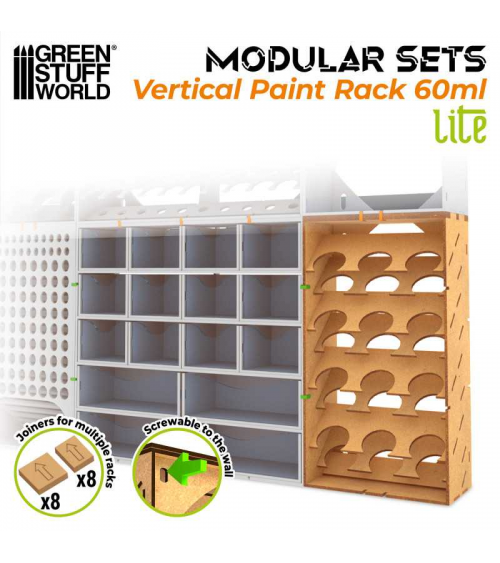 Organisateur de peinture verticale modulaire en bois MDF de haute qualité. Plusieurs modules pourraient être combinés horizontalement et verticalement pour augmenter l'espace d'exposition. Il est livré démonté, mais il est très facile à assembler. Nous recommandons l'utilisation de colle blanche pour une finition plus robuste.