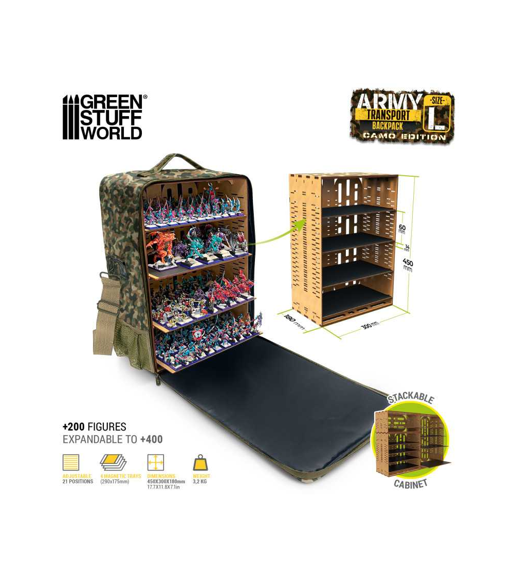 Avec une capacité de transport de plus de 200 figurines, ce sac à dos est parfait pour ceux qui doivent transporter un grand nombre de figurines lors de tournois, de sessions de jeu ou d'expositions. Les figurines sont réparties sur quatre niveaux, ce qui permet une organisation efficace et accessible. Ce système de rangement est complété par des plateaux métallisés amovibles, qui facilitent le rangement et l'accès aux figurines. Les plateaux en MDF sont recouverts d'un revêtement métallique adhésif qui offre une base stable et sûre pour les figurines magnétisées. Le sac à dos comprend quatre plateaux et 21 hauteurs réglables, ce qui permet de personnaliser l'espace intérieur en fonction des besoins spécifiques de chaque utilisateur et de la taille des figurines.