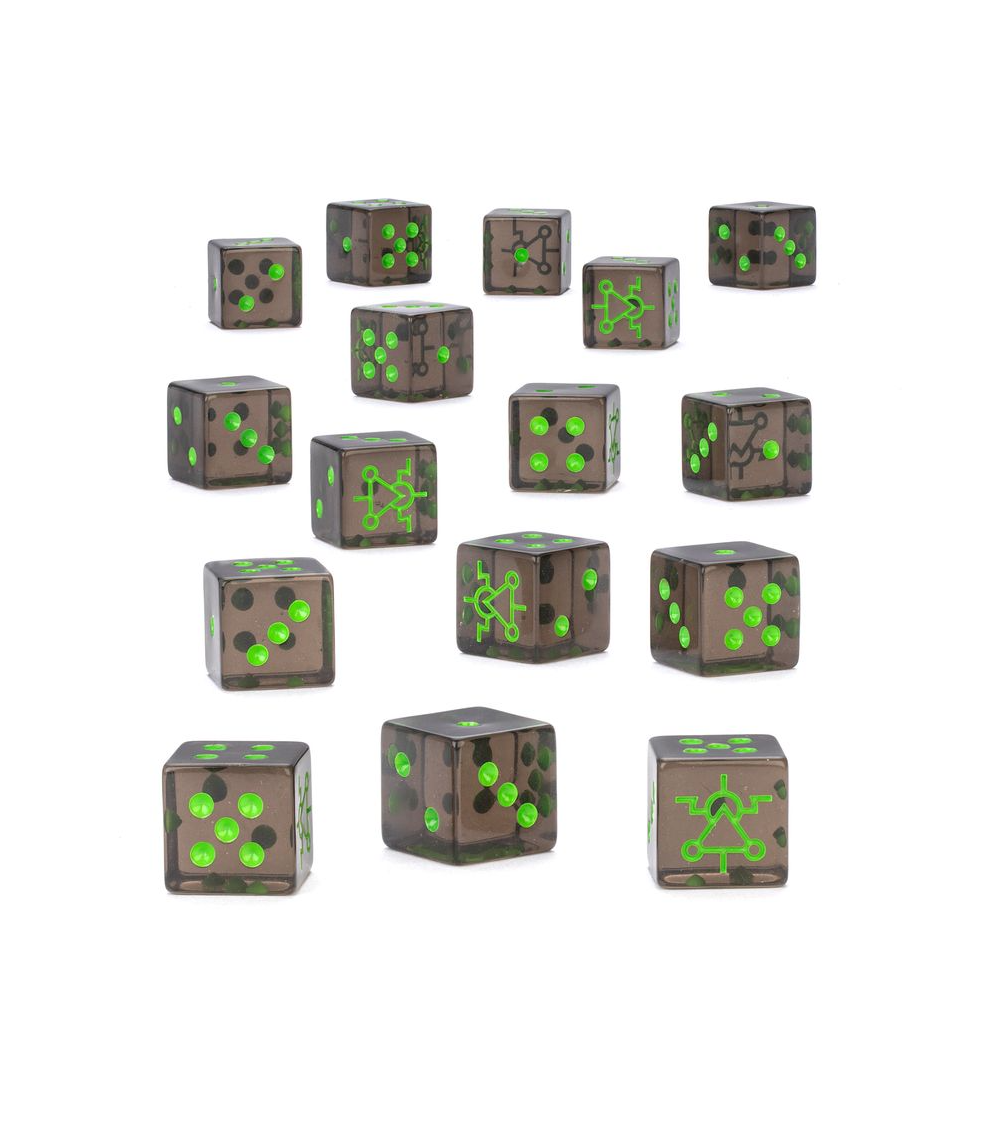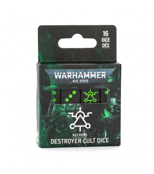 Ce set comprend 16 dés à six faces aux arêtes carrées à utiliser pour vos parties de Warhammer 40,000, sur le thème des Cultes Destroyers Nécrons. Ils sont moulés en plastique acrylique noir rappelant des gemmes avec des marquages vert clair, et mesurent 16mm de côté. Les faces de 1 à 5 sont numérotées par des points de façon traditionnelle, et chaque face du 6 est décorée de l'icône retorse des Cultes Destroyers Nécrons. Ces dés thématiques ne sont disponibles que dans la limite des stocks.