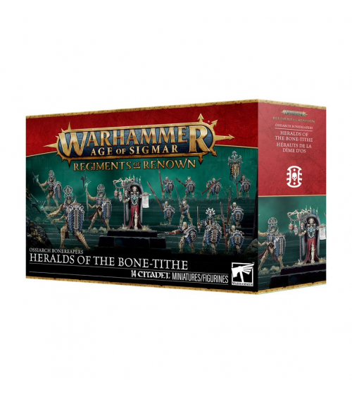 Cette boîte permet d'assembler les Hérauts de la Dîme d'Os, un Régiment de Renom pour vos armées de Cours de Mangechairs, de Hantenuits ou de Seigneurs Ruinemânes dans les parties de Warhammer Age of Sigmar. Les unités individuelles peuvent également être utilisées dans votre armée de Collecteurs Ossiarques, en vous faisant faire des économies par rapport à un achat des kits au détail. Cette formation est menée par Vokmortian, le Maître de la Dîme d'Os. Il est escorté par une unité de Gardes Immortis, des protecteurs d'élite dotés d'énormes boucliers et de hallebardes. Le reste de la force est composé de Gardes Morteks, des troupes de ligne inflexibles qui excellent à prendre et tenir les objectifs. Ajoutez ce contingent robuste et costaud à vos armées pour les renforcer.