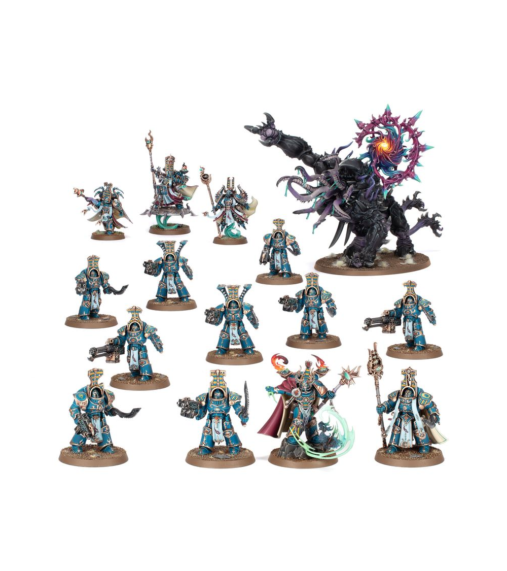 Cette boîte pleine à craquer est parfaite pour entamer une nouvelle collection des Thousand Sons ou pour étoffer une armée existante que vous pourrez ensuite déchaîner dans les parties de Warhammer 40,000, en faisant des économies par rapport à un achat des kits au détail. Cette force est menée par un Maître Infernal, un puissant sorcier capable d'invoquer des démons et de confondre l'esprit de ses ennemis à l'aide de ses sorts, ainsi que par un trio de Sorciers Exaltés qui feront en sorte qu'aucun endroit du champ de bataille ne soit à l'abri de votre domination psychique. Deux unités de Terminators du Scarabée Occulte – des fantassins d'élite maniant de redoutables armes ensorcelées – constituent l'ossature de la force. Ils sont soutenus par une Mutalithe à Vortex, une créature ayant horriblement muté sous l'influence de Tzeentch, et capable de dissoudre la raison de ses adversaires avant de les déchiqueter de ses immenses griffes.