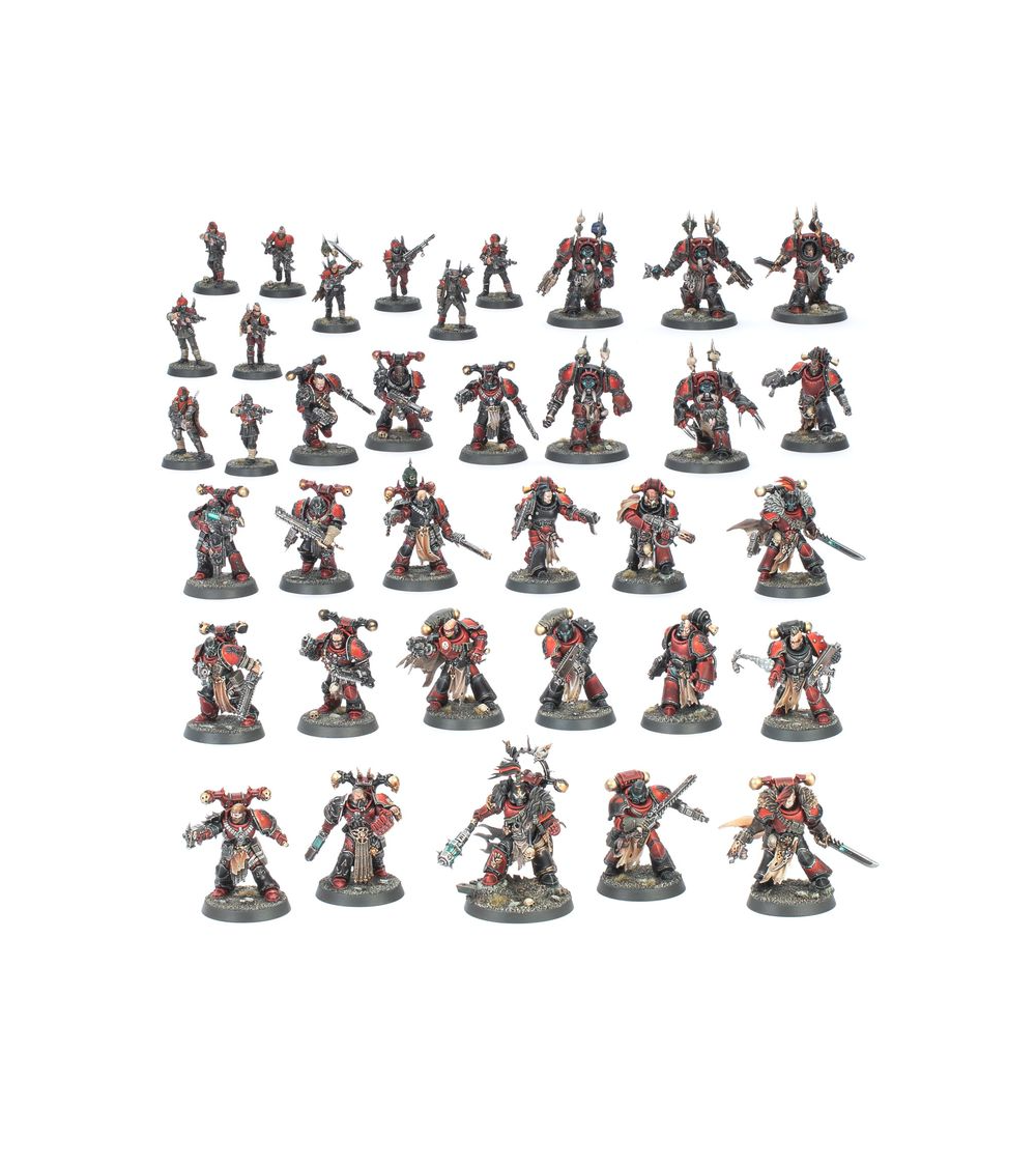 Cette boîte pleine à craquer est idéale pour entamer une nouvelle collection de Space Marines du Chaos sur le thème des Red Corsairs ou étoffer une armée existante, à déchaîner dans les parties de Warhammer 40,000 tout en faisant des économies par rapport à un achat des kits au détail. Cette force sauvage est menée par un Capitaine-Écumeur Red Corsair, un guerrier impitoyable qui règne d'une main de fer. Il est accompagné de Pillards Red Corsairs, des Space Marines renégats qui ont renoncé à leurs serments pour suivre le Tyran de Badab. Légionnaires vétérans et Terminators du Chaos comptent parmi les partisans de Huron Blackheart, renforçant les Red Corsairs par leurs nombreuses années d'expérience guerrière. Les Gardes Renégats sont parfaits pour tenir les objectifs ou se jeter sur l'ennemi pour l'affaiblir. Le tout forme une force cruelle et terrifiante, idéale pour représenter un Détachement de Bande de Renégats, dont les règles se trouvent dans The Maelstrom: L'Antre du Tyran – Détachements, disponible séparément.