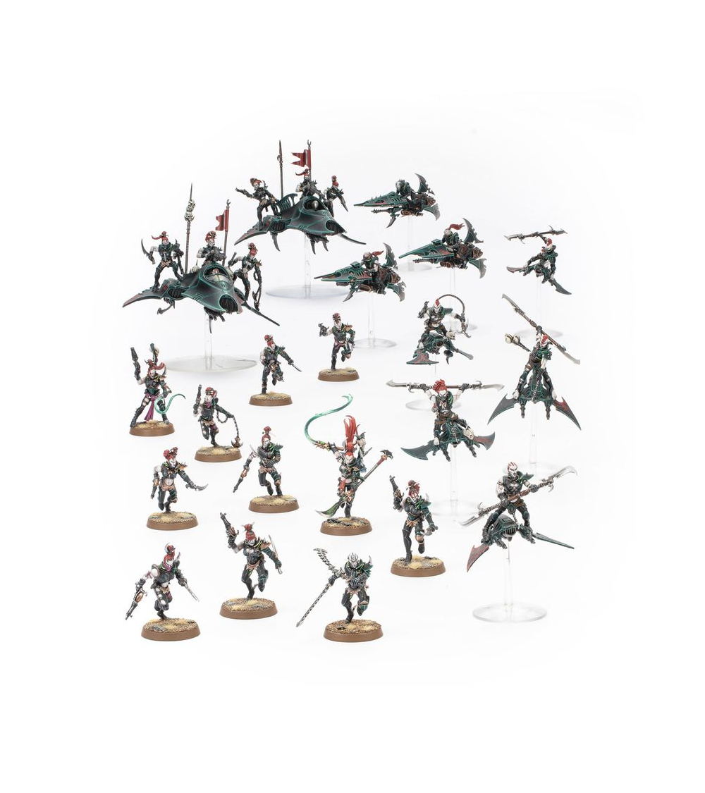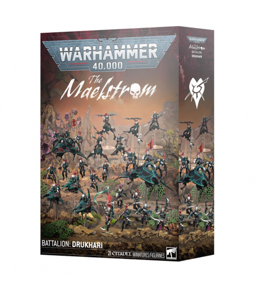 Cette boîte pleine à craquer est parfaite pour entamer une nouvelle collection de Drukhari ou étoffer une armée existante, à déchaîner dans les parties de Warhammer 40,000 tout en faisant des économies par rapport à un achat des kits au détail. Menés par une Succube qui charge en plein cœur des combats pour récolter une sanglante moisson, ces guerriers constituent une force agressive. Les Cérastes forment le noyau de ce bataillon, des gladiateurs à pied animés par une soif de sang et un sens cruel du spectacle. Les Hellions et les Écumeurs ajoutent de la vitesse à votre armée et lui permettent de contrôler le champ de bataille en allant chercher les objectifs les plus lointains, en harcelant l'ennemi et en éliminant les unités affaiblies. Deux Venom apportent un appui feu et permettent à votre infanterie d'avancer plus rapidement. Toutes ces unités combinées constituent une armée rapide qui frappe fort quand et là où vous le voulez, idéale à jouer avec le Détachement Spectacle de Cruauté, dont les règles se trouvent dans le Codex: Drukhari, disponible séparément.