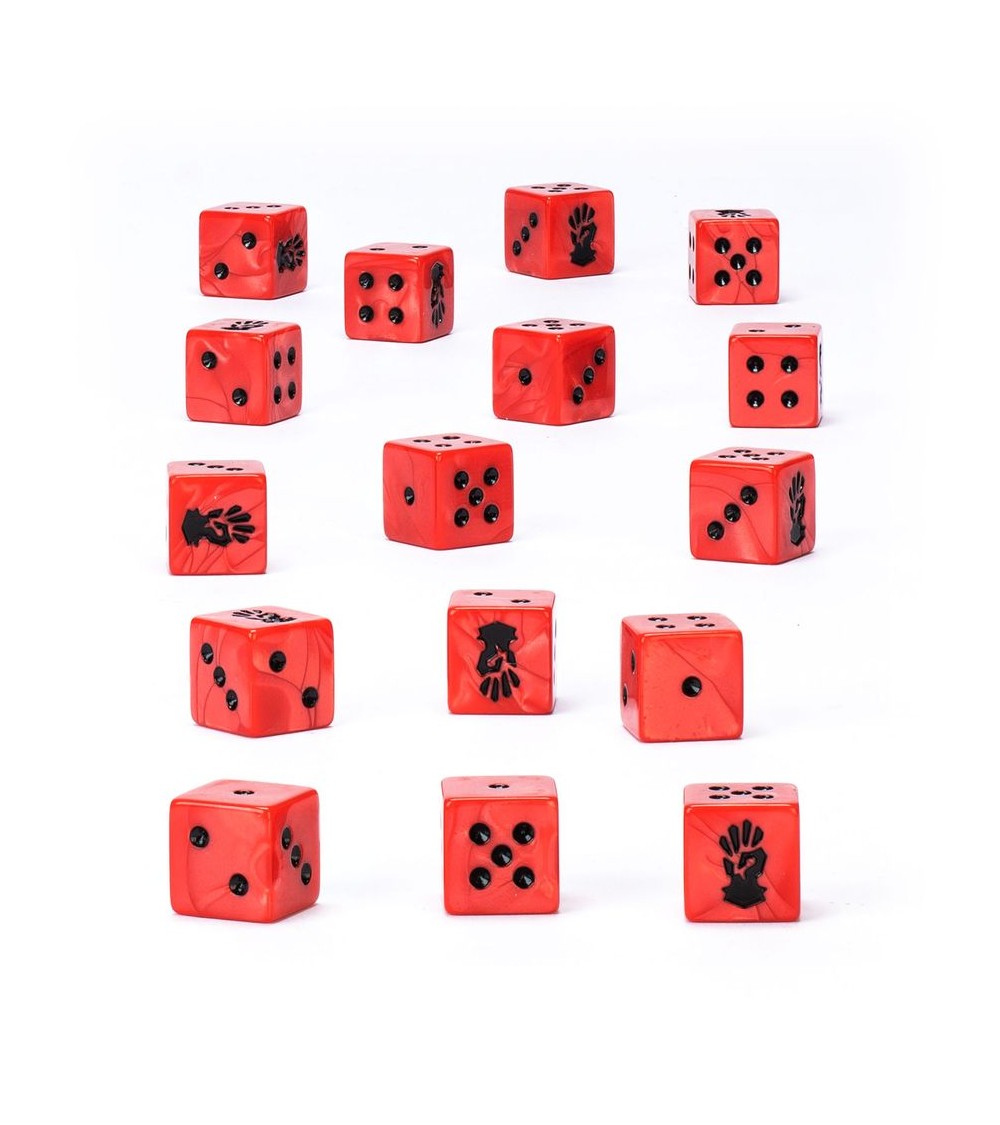 Ce produit est un set de 16 dés à six faces, aux angles carrés, utilisables dans les parties de Warhammer 40,000 et sur le thème des Red Corsairs. Ils sont moulés en plastique acrylique rouge nacré avec des marquages noirs et mesurent 16mm de côté. Les faces 1 à 5 sont numérotées de façon traditionnelle, et chaque face du 6 est ornée de l'icône intimidante des Red Corsairs. Ces dés thématiques sont uniquement disponibles dans la limite des stocks.