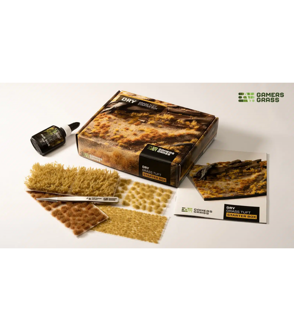 Cette boîte de départ contient 4 feuilles complètes de touffes d'herbe, 1 paire de pinces, 1 bouteille de colle PVA et 1 livret de conseils de base.
