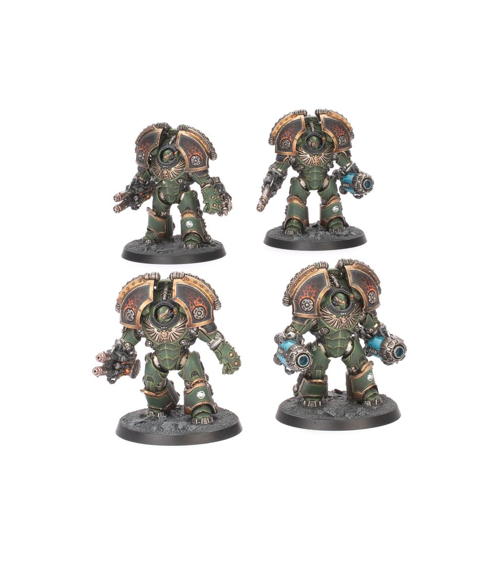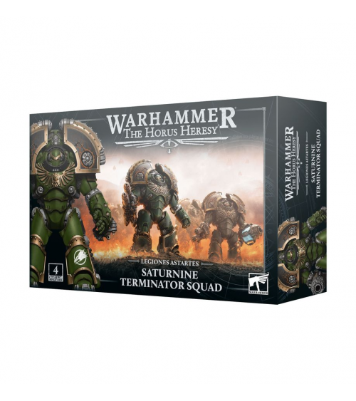 Observé pour la première fois sur les sables noirs d’Isstvan V, le modèle d’armure Saturnine développé par Vulkan est plus massif et plus encombrant que les autres variantes d'armure Terminator. Dotés d'un éventail d'armes à énergie dévastatrices, associées à un système complexe de boucliers d'énergie, les guerriers portant ces armures peuvent avancer sans encombres sous le déluge de tirs de l'ennemi.
