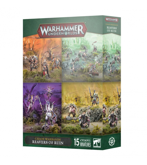 Ce kit rassemble quatre bandes sur le thème du Chaos pour Warhammer Underworlds. Toutes les figurines sont à emboîter, moulées en plastique coloré, et intègrent des socles scéniques afin que vous puissiez rapidement commencer à jouer. Vous y trouverez également des cartes de charte et des cartes de combattant pour chaque bande. La Meute de l'Âme Noueuse est une bande Polyvalente, la Meutegriffe de Skittershank est une bande de Frappe agressive, la Triple Discorde et les Verructés offrent un style de jeu de Maîtrise, qui récompense une gestion minutieuse.